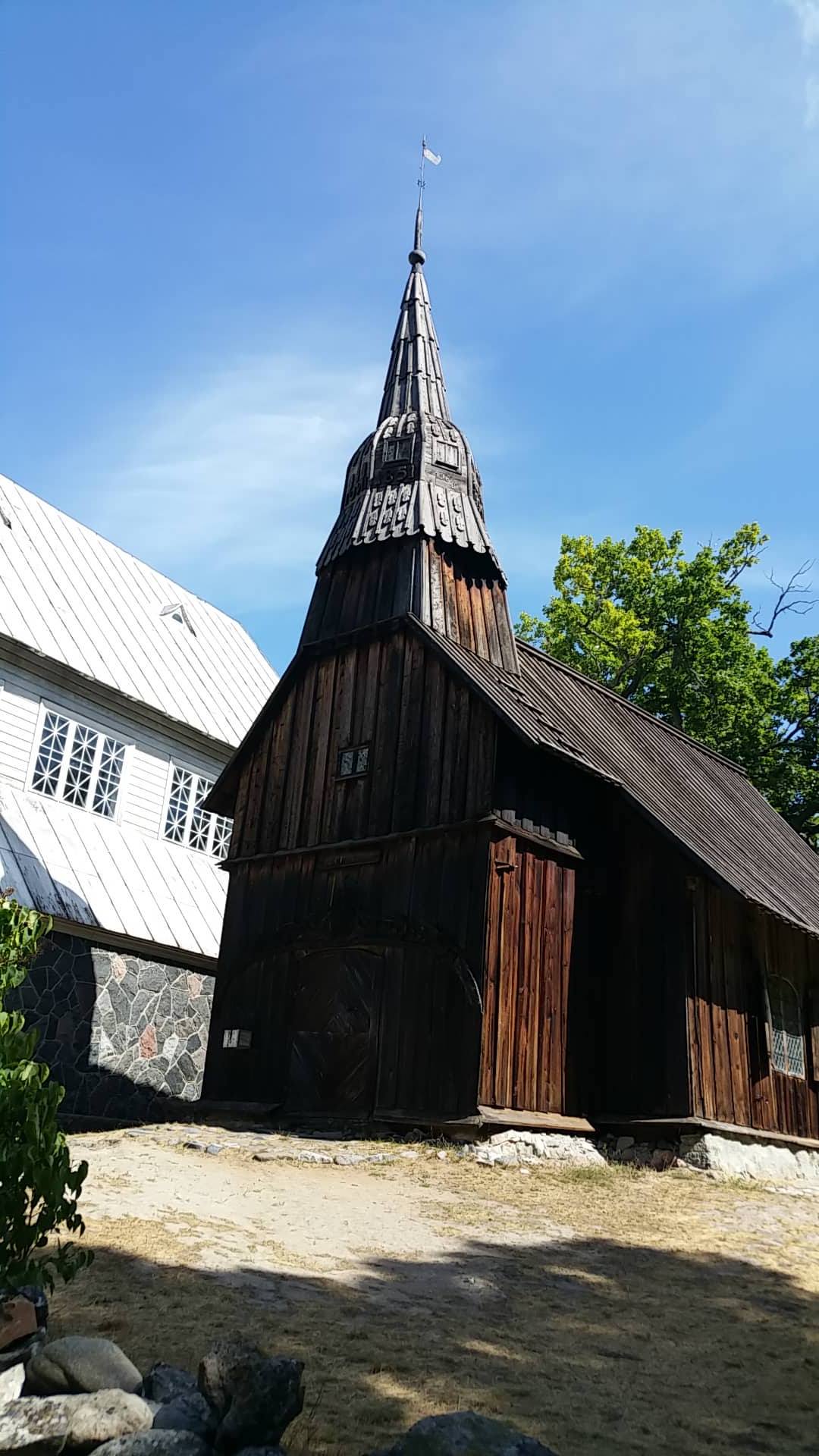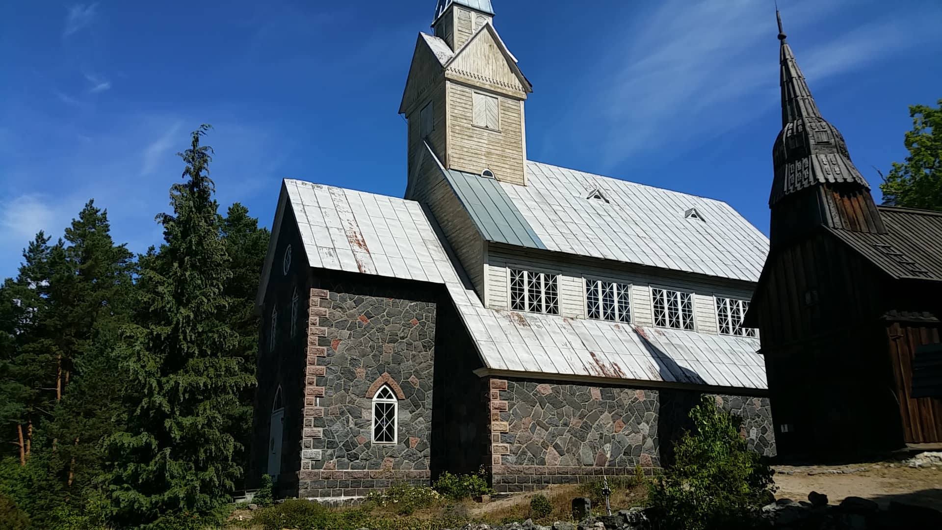Ruhnu puukirik ja sealsamas kõrval, Muhu meistermeeste poolt ehitatud uus kivikirik.